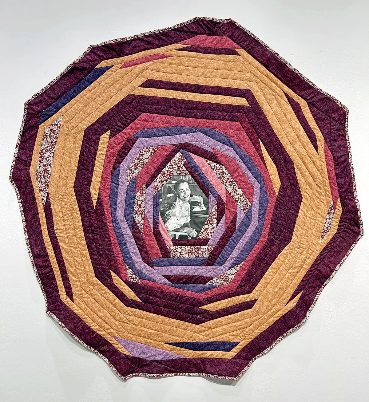 Ellamaria Foley-Ray, Circle, Be Unbroken!, 2026, canvas and fabric, 53 x 52 inches. A photograph of Dr. Rachel Bassette Noel is in the center. Image by Brandy Coons.