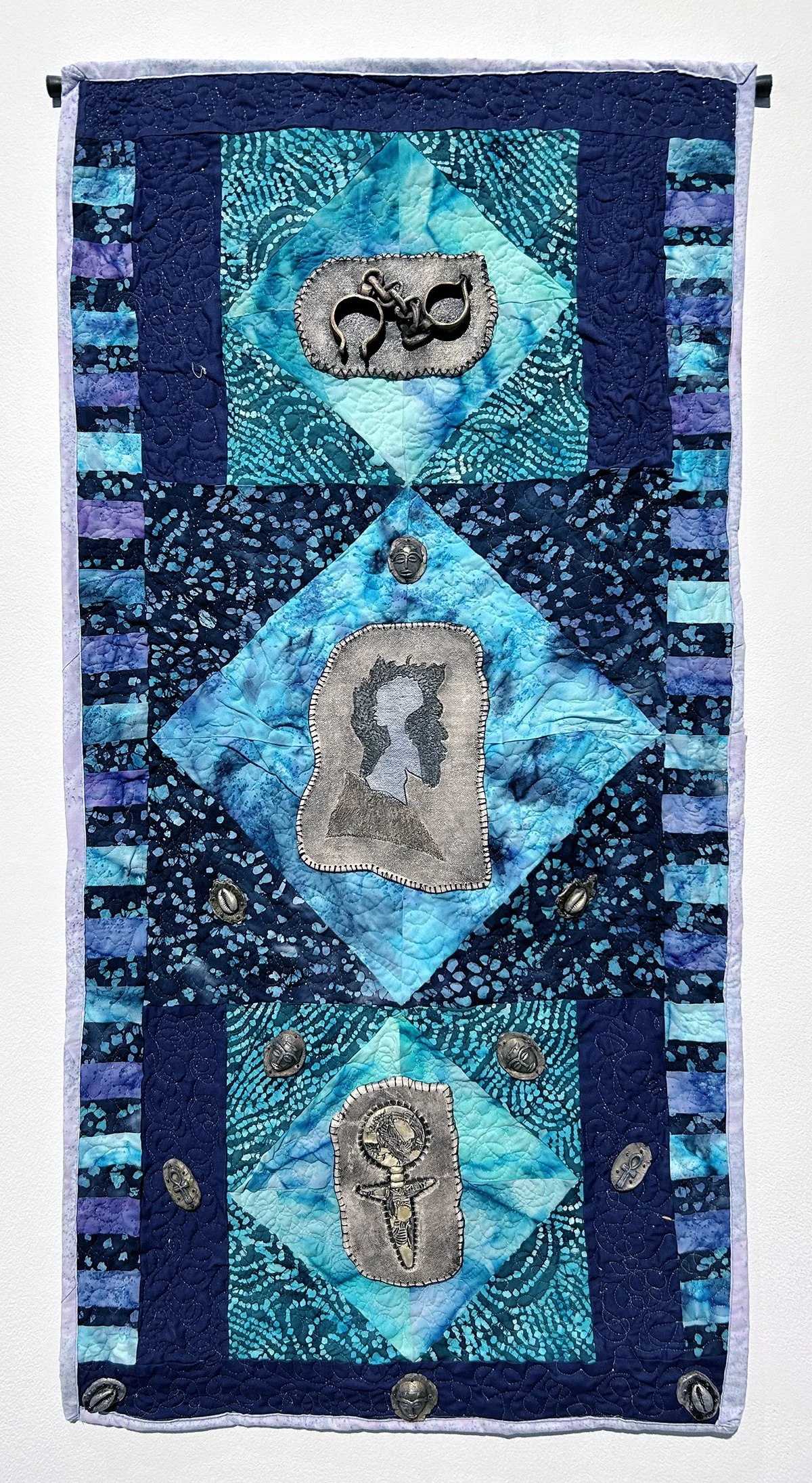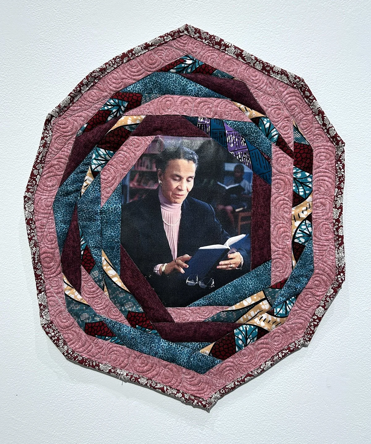 The quilted works in the exhibition that are dedicated to Dr. Noel feature centerpieces of photographs printed on canvas. For instance, the work titled The Visionary's Granddaughter includes a color photo of Dr. Noel reading from a book, framed by an oval of patterned quilted fabrics in blue, burgundy, and pink. The artist drew this image and others from historical archives that depict Dr. Noel’s family and friends. They appear in one major grouping of rectangular works and another grouping of circular pieces focused on people from the wider community.
