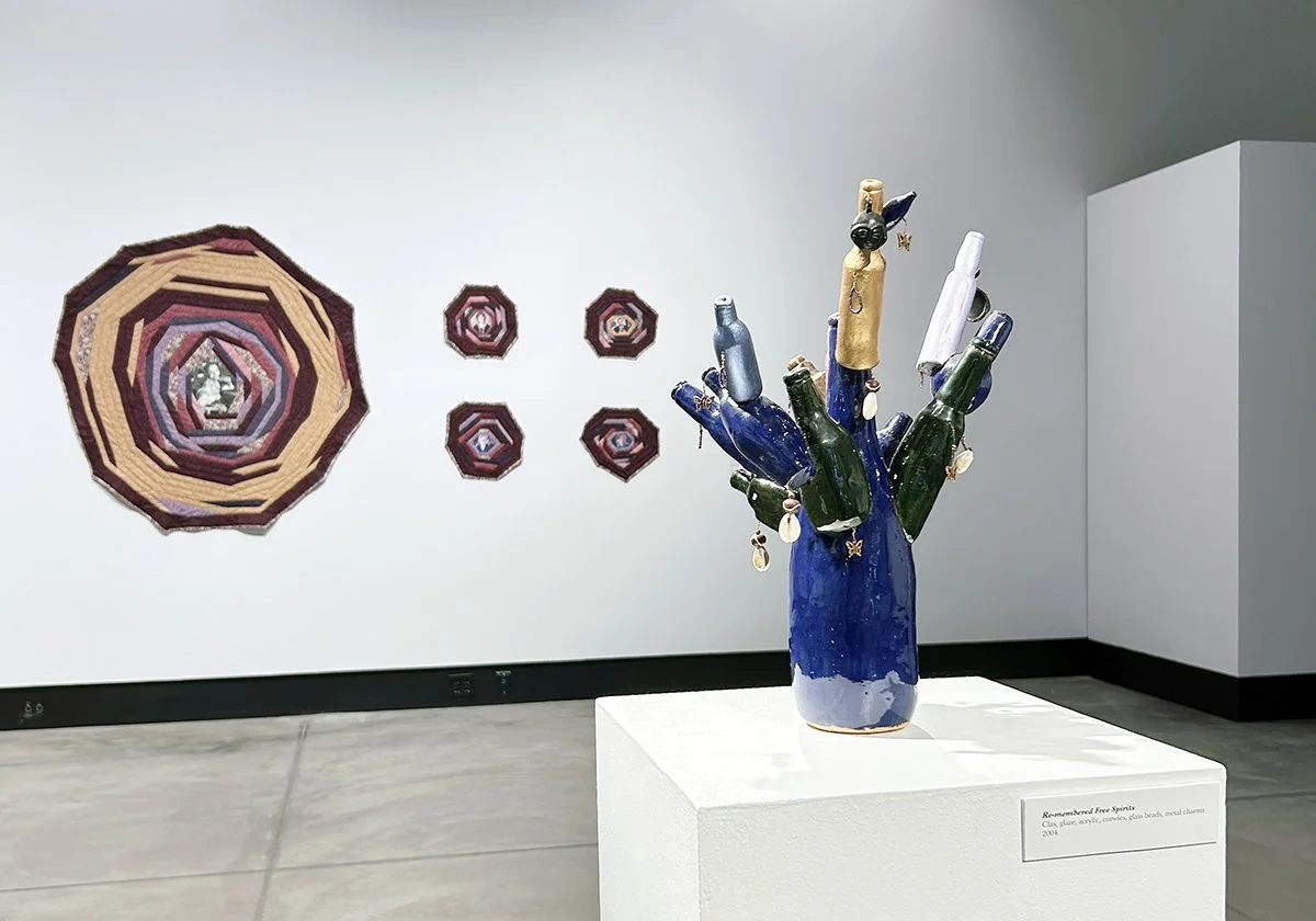 In the foreground: Ellamaria Foley-Ray, Re-membered Free Spirits, 2004, clay, glue, acrylic, cowrie shells, glass beads, and metal charms, 15 x 11.5 x 10.5 inches. Image by Brandy Coons.