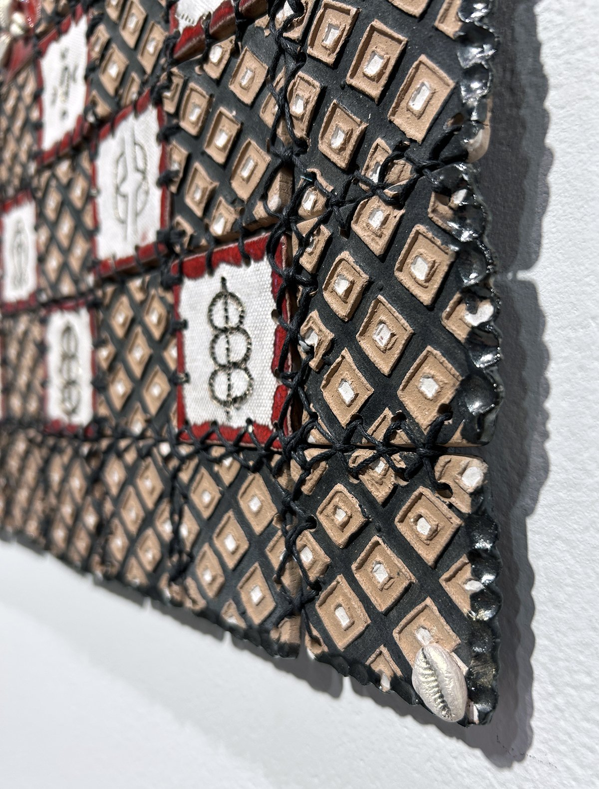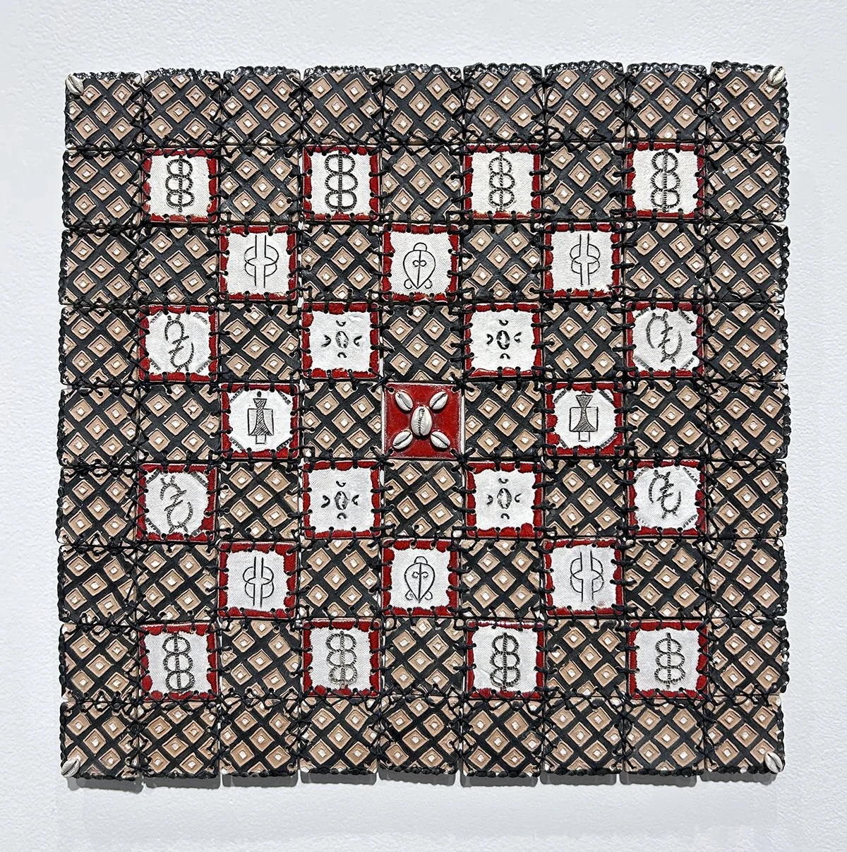 Learning to work with fabric paralleled her practice in stitching clay. In the wall piece Proverbial Quilt of Desire, for example, the artist threads together clay tiles with a diamond pattern in black, brown, and white. Red-bordered tiles frame black symbols on white-painted cotton and the central tile is embedded with cowrie shells.