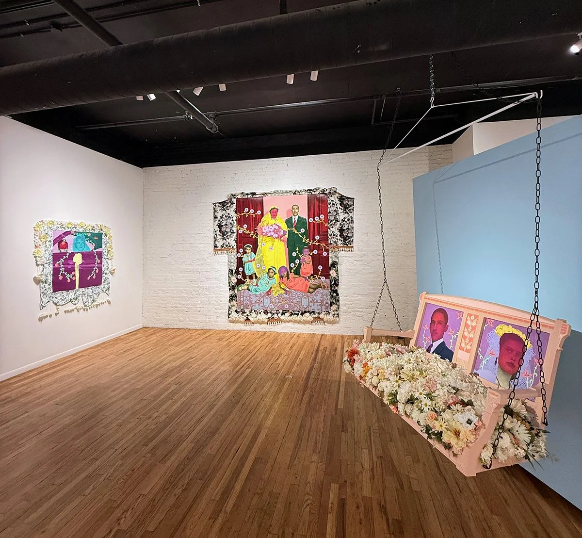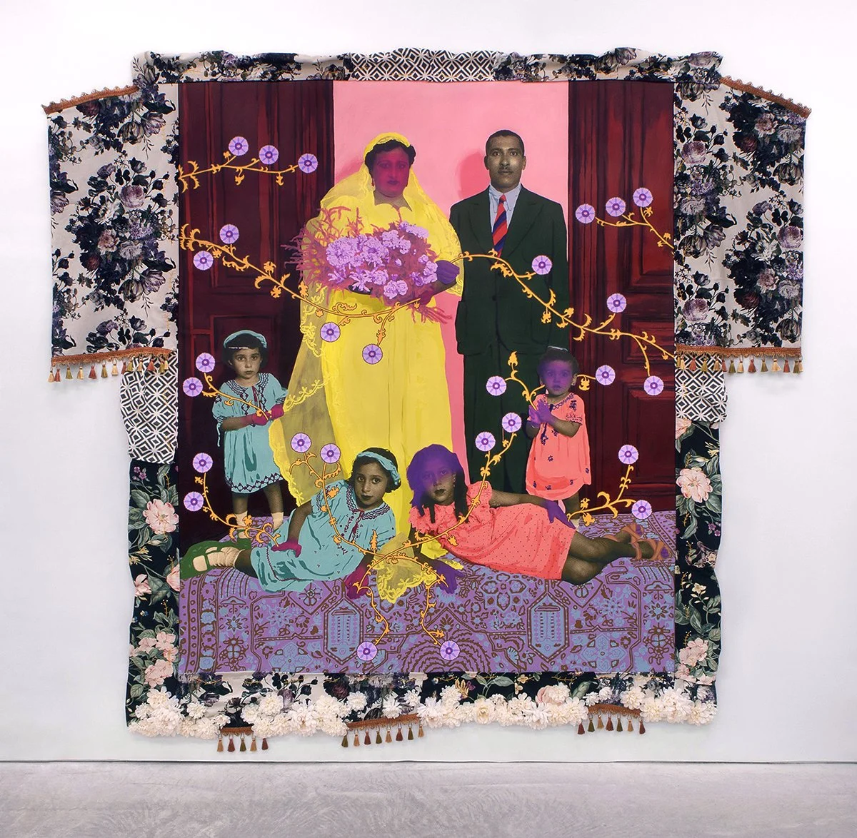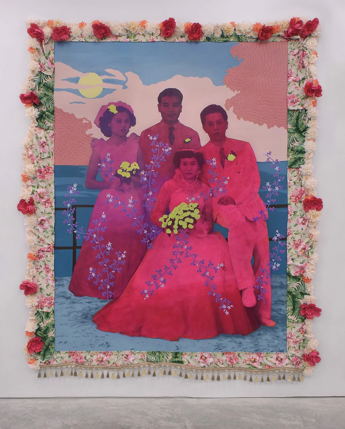 Daisy Patton, Untitled (Wedding Portrait with Children and Rug and Orange Vines with Multicolored Flowers), 2024, oil on archival print mounted to canvas with fabric, embroidery, tassel fringe, floral buttons, and fabric flowers, 111 x 117 inches. Image courtesy of K Contemporary.