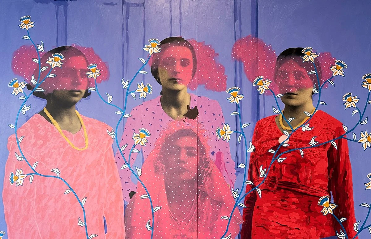 Daisy Patton, Untitled (Wu 26 ul 1956 Keng U Photo 154 High, K.L.), 2025, oil on archival print mounted to canvas with fabric, embroidery, tassel fringe, floral buttons, and fabric flowers, 107 x 92 inches. Image courtesy of K Contemporary.