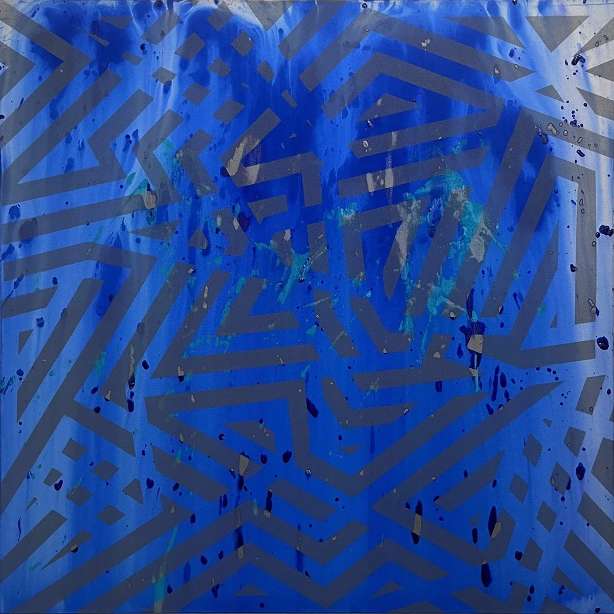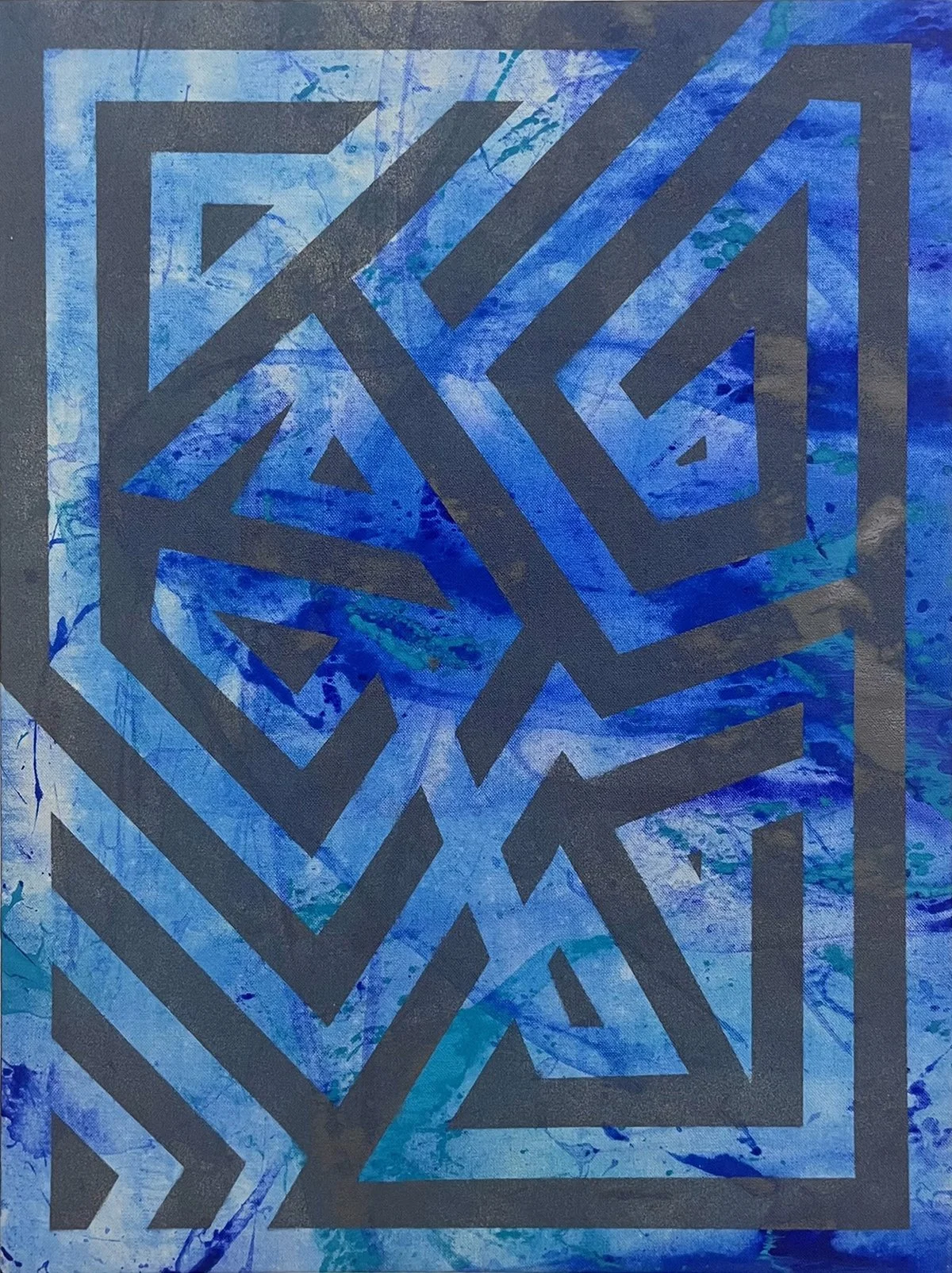 La’Ford identifies sensations, feelings, and meanings beyond pre-existing language, even for blue. She reminds us that there is no hard count on the colors and shades of this world because color, like feeling, is spectral and often at home in contradiction or the in-between. Works like Liminal Fragments, which features an overall maze pattern in blue over a dark ground, are streaky and full-throated, with azure and indigo hues, and a staccato-legato quality, all at once.