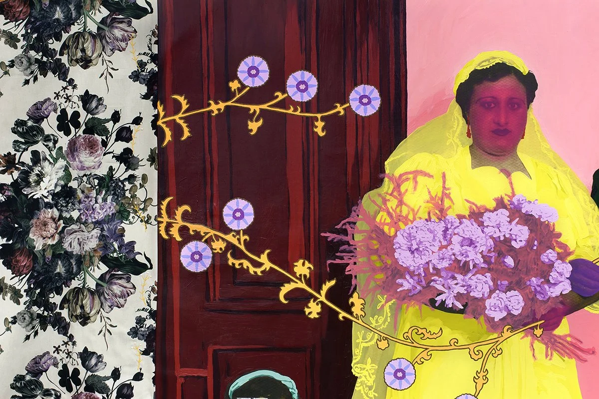 Daisy Patton, Untitled (The Bridal Party), 2022, oil on archival print mounted to panel, 90 x 68 inches. Image courtesy of K Contemporary.