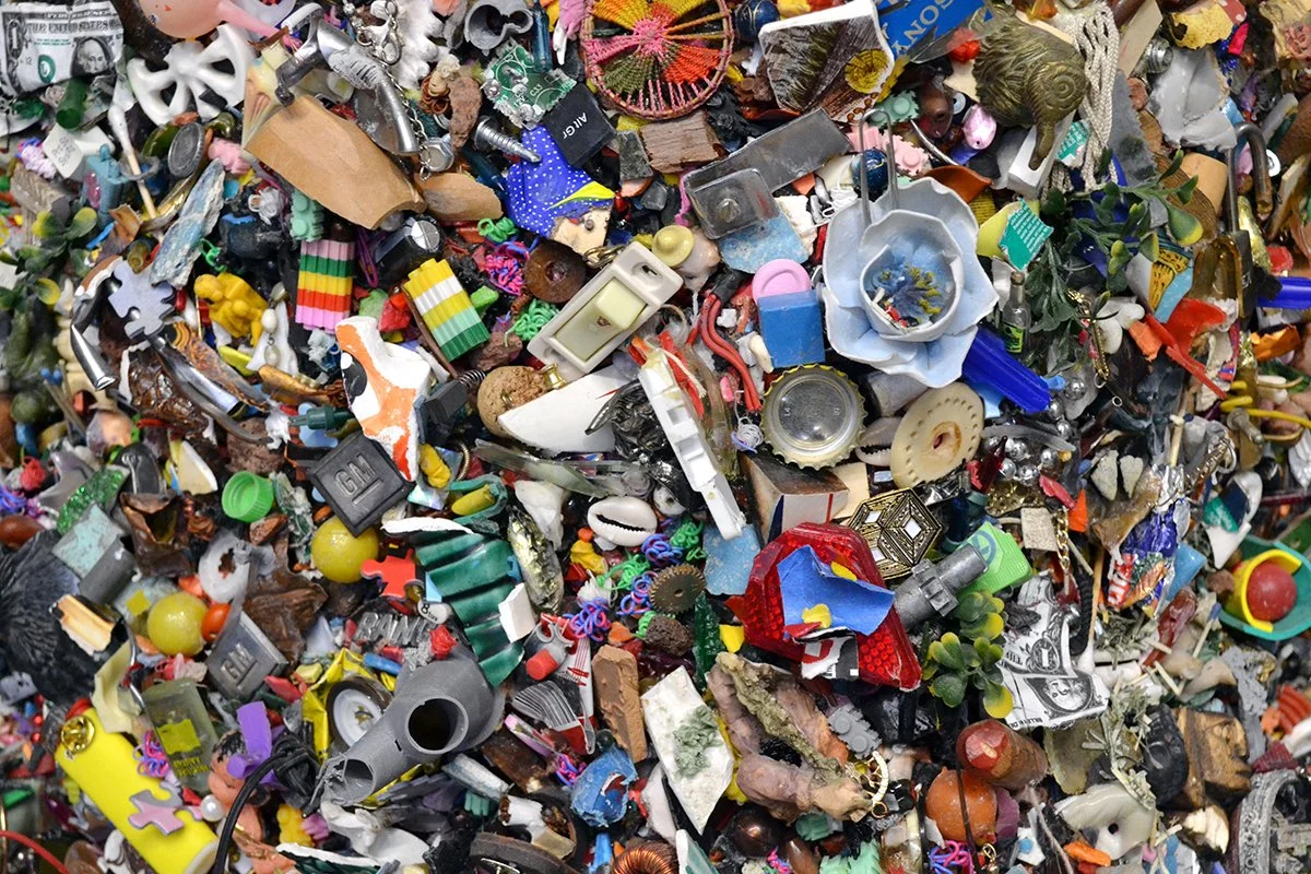 The work layers memory into its form: each object carries traces of past lives, embedded into a singular baroque pearl. These are objects we have let go of, either because we can no longer hold them or because they are no longer needed. The sculpture rests on a pedestal shaped like an oyster or mollusk trap, anchoring the work in a form designed to capture the creature for its eventual death.