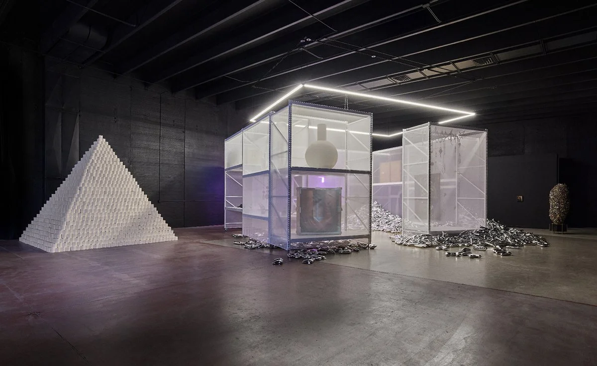 Though the space is enormous, the exhibition is confined to roughly 800 square feet near the entrance for a more intimate experience. Martin Creed’s monumental toilet paper pyramid, Work No. 1782, is the first and most immediately visible artwork in the space, evoking the resource hoarding of the COVID-19 pandemic. The irony is sharp: while pyramids once entombed pharaohs and rulers of ancient civilizations, here the form serves as a tomb for consumerism itself. It may even be read as a future monument, commemorating resources we have lost.