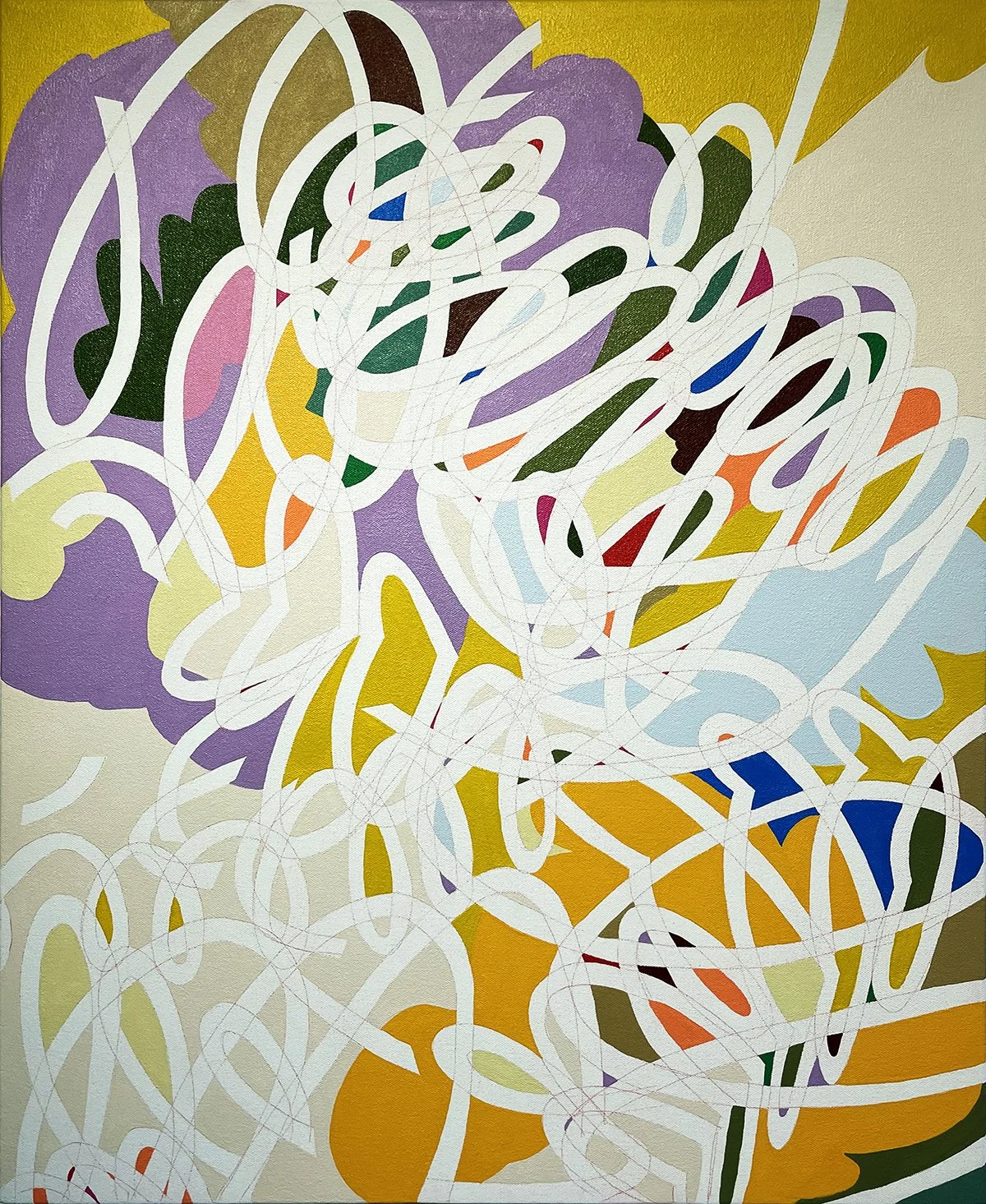 Moya’s noodles variously call to mind playground slides, slinkies and springs, or (when blocked in with paint) clouds, petals, or abstract glimpses of cartoon characters. These shapes do not coalesce into anything concretely legible. Rather they evoke daydreaming and scheming, and invite viewers to engage in imaginative associations without prescribing or confessing any singular aspect of identity or identification.