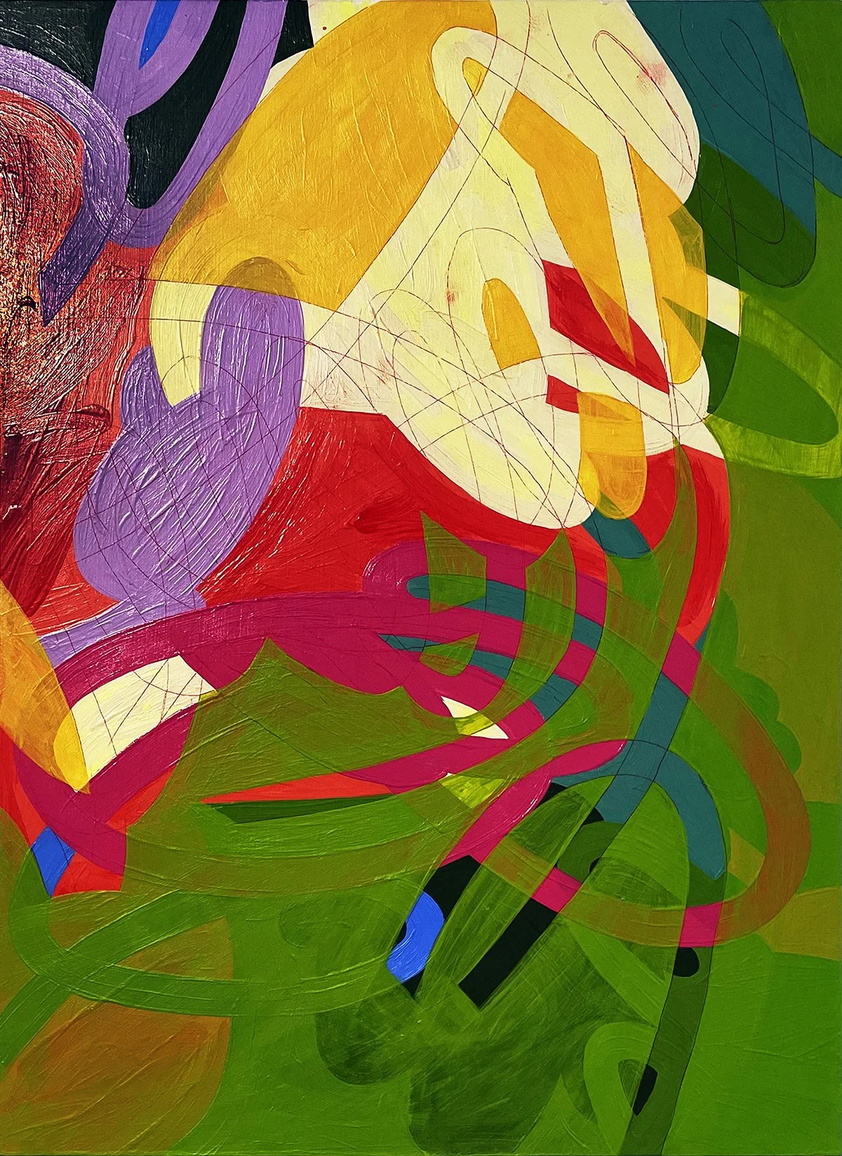 Artistic processes of revealing and masking are apparent in Dreamers Never Learn, a mash-up of traced spirals, expressively applied paint, and delicate pen drawings. In the upper left corner of this work on paper, curly cues merge in and out of thickly applied lavender, cerulean, and lime acrylic paint. In the middle left of the composition, a layer of translucent yellow veils the scribbles and squiggles beneath. At nearly the center of the composition, a sketched hand emerges from a field of modulated green paint and pen-drawn noodles.