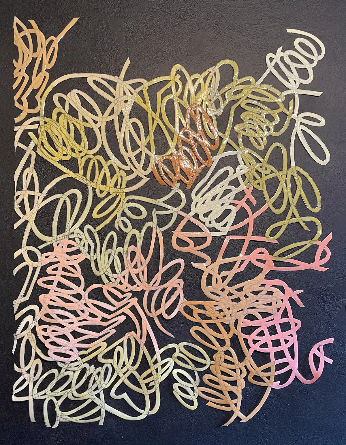 A process of change seems to be at play in The Way The Sourness Overtakes The Cream. Here, Moya’s noodles whip, swivel, and coil together in an animated knot of peachy pinks, putrid icterines, and chartreuse hues. Drawn on a sheet of mylar, further delineated by layers of acrylic paint, and cut from the polyester film, the translucent and shiny tangle curls dynamically away from the black wall of the project space.