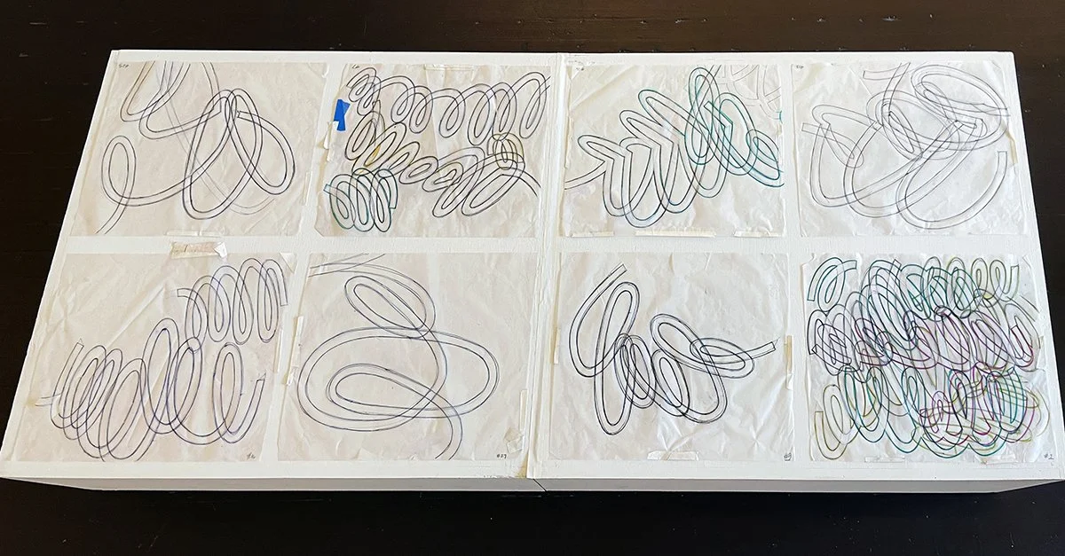 Despite the indeterminacy of such an attempt, the artist’s use of these particular designs in her paintings is apparent in the jagged cuts visible in some of the marks delineating the noodles on tracing paper. Slices open where the pen met paper over and over and over in the artist’s process of transferring the noodles to multiple substrates. These incisions suggest the violence of inscription but also a kind of liberatory action, in which self-identification might release a subject from the confines of an imposed identity.