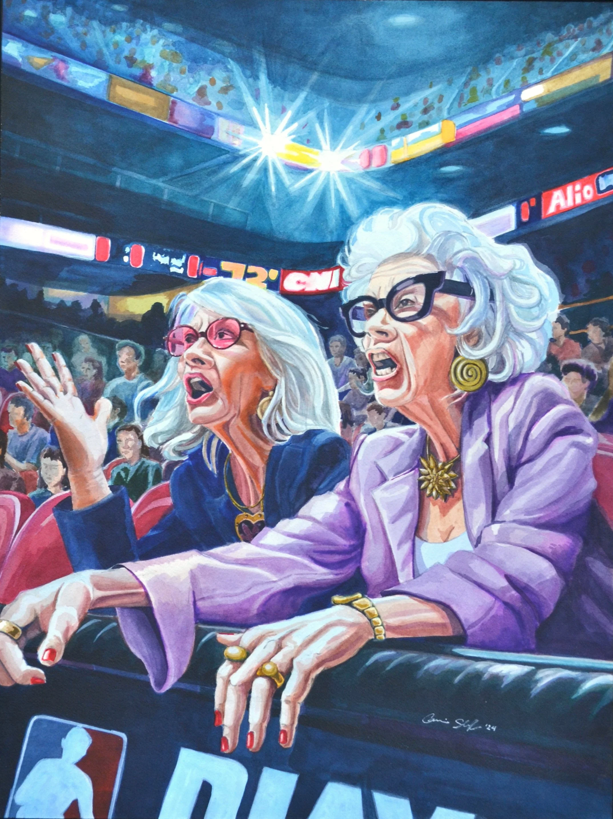 The women in Shiffrin’s work appear to prefer the louder, less controlled spaces where unrestrained expression reigns. Refs you suck! features a low angle view of two exasperated older women, mouths contorted to fling profane words at the referees. It’s a painting with loud lights, loud colors, loud energy, and unapologetically deep wrinkles. Shiffrin’s senior women have aged out of the male gaze’s surveillance, instead reveling in their own discerning taste and joie de vivre.