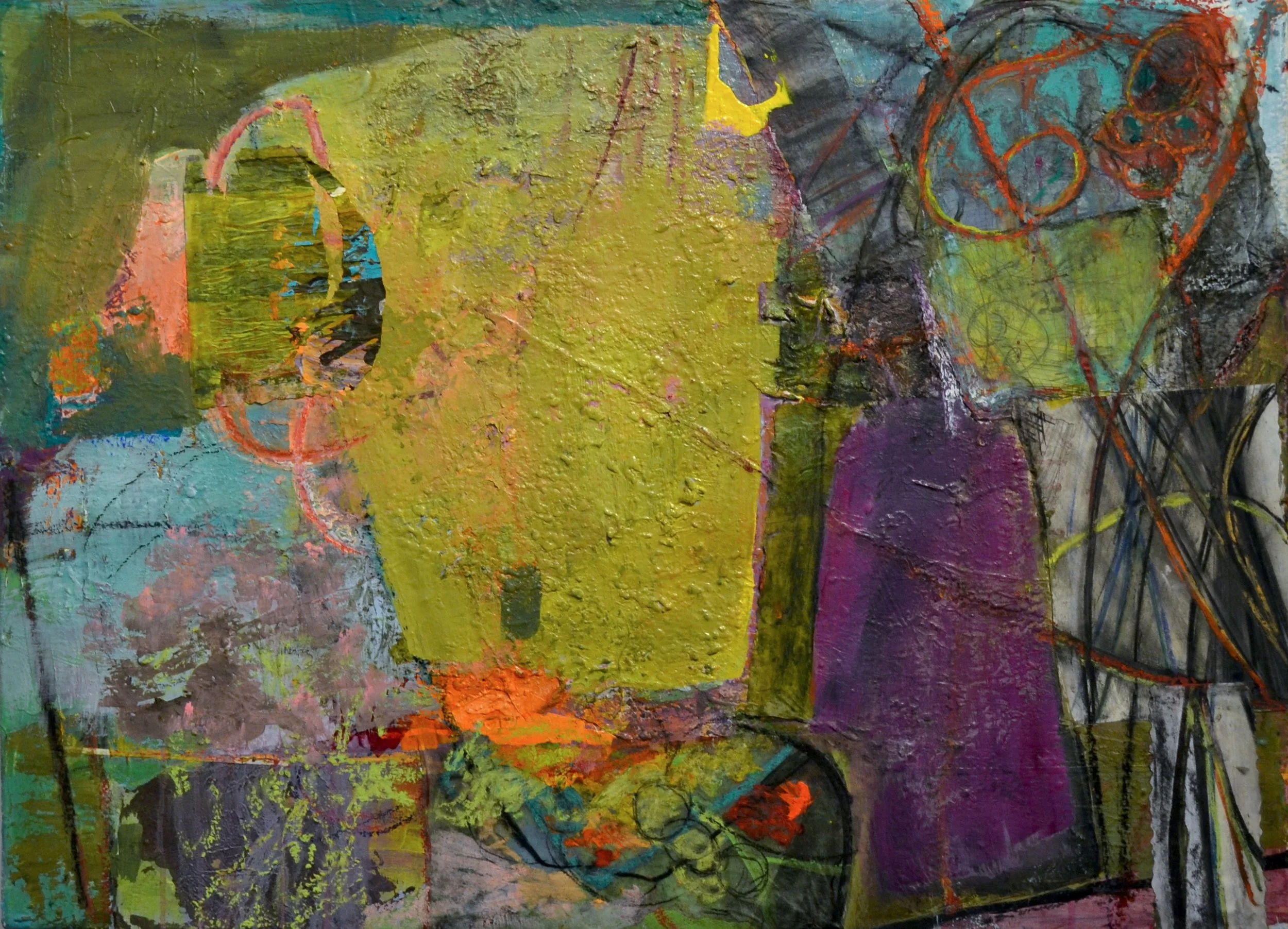 Despite the many layers of textured acrylic, pastel, charcoal, and collage, In the Gardens retains a freshness of color. Safety vest orange plays well with the murkier olive greens and smudged charcoal lines. A swatch of primary yellow at the top keeps the gradients from sliding too smoothly into one another; you cannot have good abstraction without disruption.