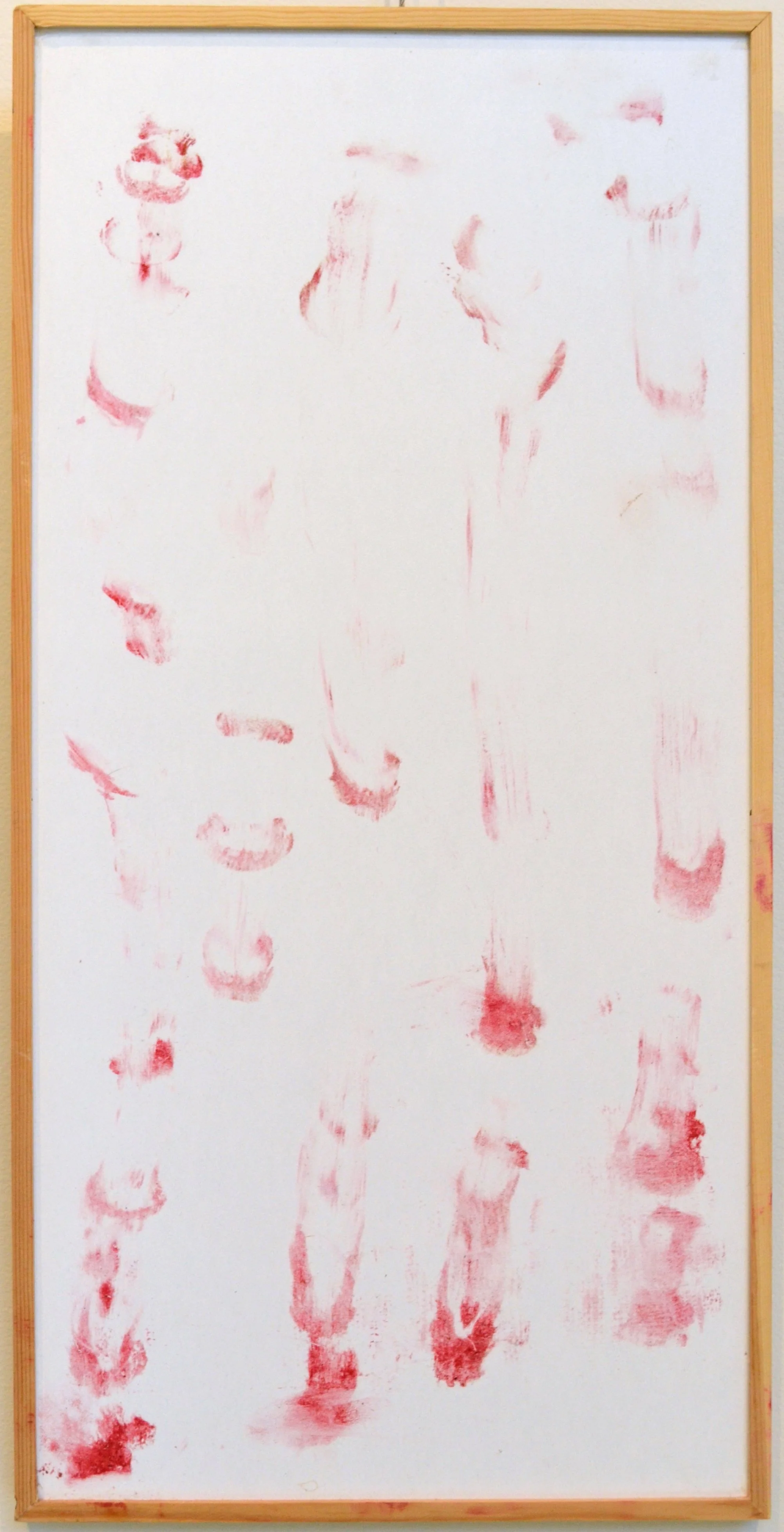Jasmine Dillavou, Fought Forever, lipstick on panel. Image by Paloma Jimenez.