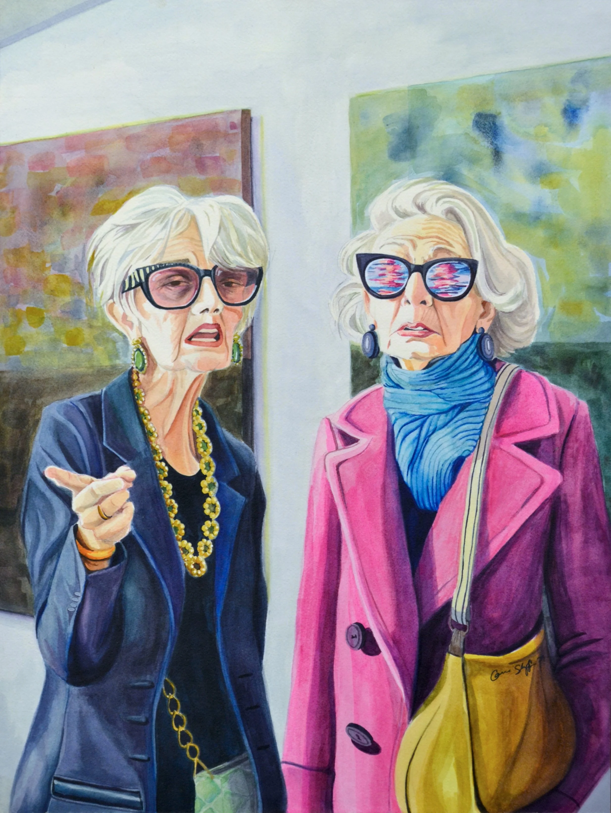 In This shlak?, Shiffrin depicts two stylish gallery hoppers, draped in jewel tones and adorned with bold accessories. Their white hair flows with effortless panache. Despite such vibrant outfits, their animated frowns assess their surroundings. They’ve seen it all, glancing sideways with mouths open in midsentence, as if asking the viewer, “Is there any original art left these days?”