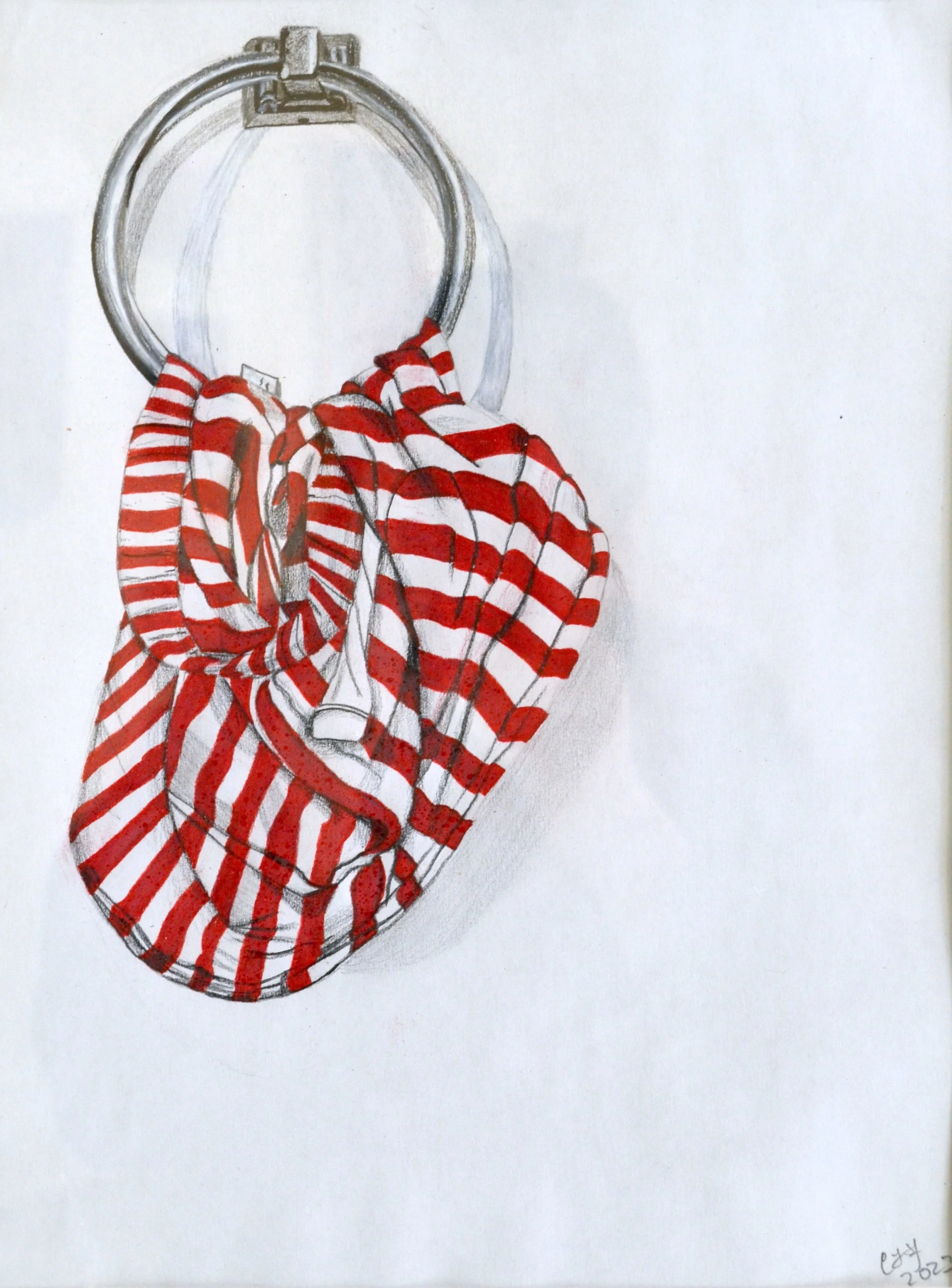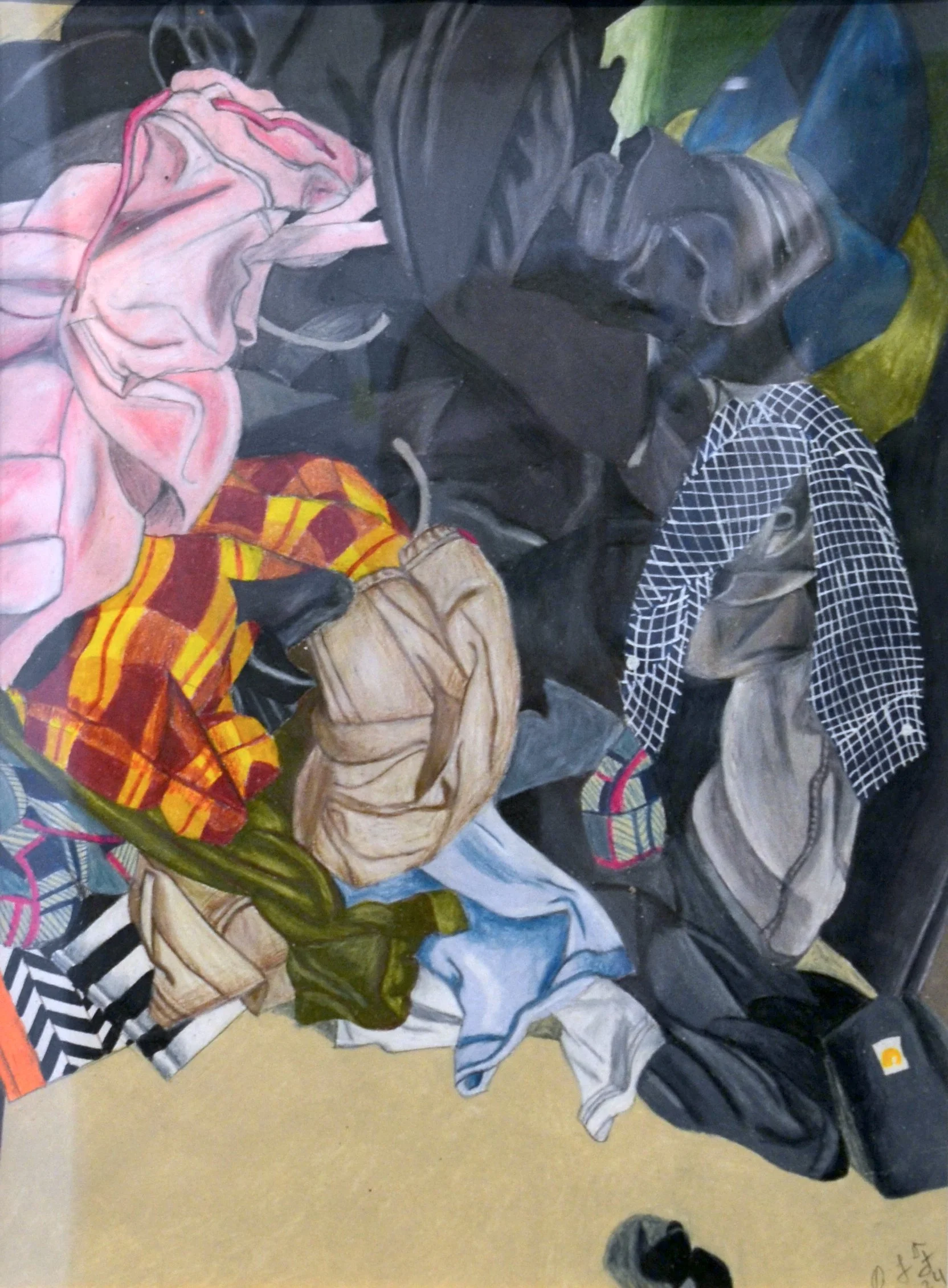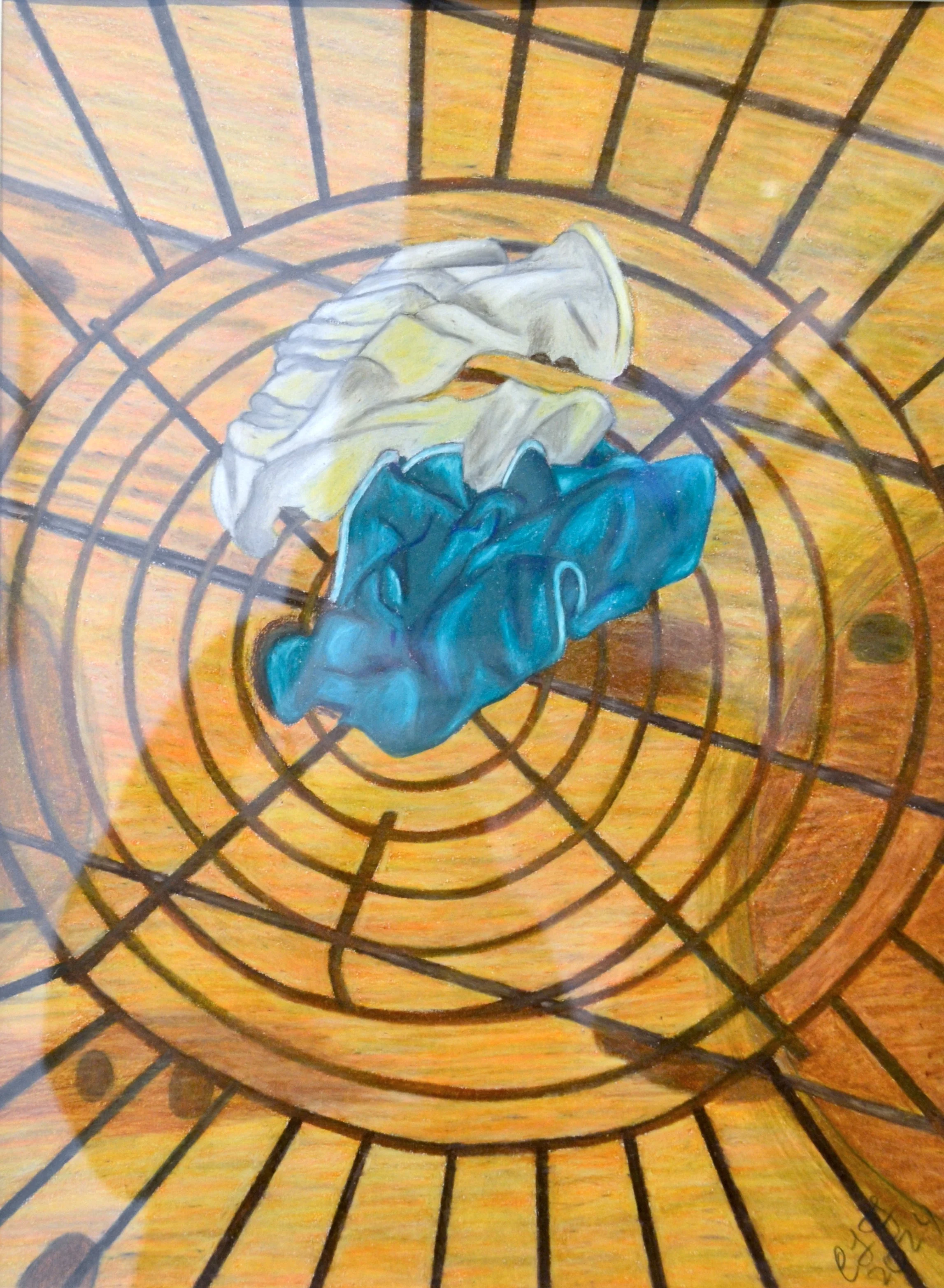 The drawing titled She didn’t mean anything to me hints at the more emotional memories that clothing can ignite. A striped red and white garment hangs limply from a chrome hand towel rack; misplaced and somewhat lonely on the wall. Up your meds expresses a similar feeling of isolation. A yellowed pair of socks and a small teal garment sit at the bottom of an otherwise empty wire basket. Sometimes a laundry basket is empty because the laundry is freshly cleaned, other times it’s because you haven’t changed out of your clothes in days.