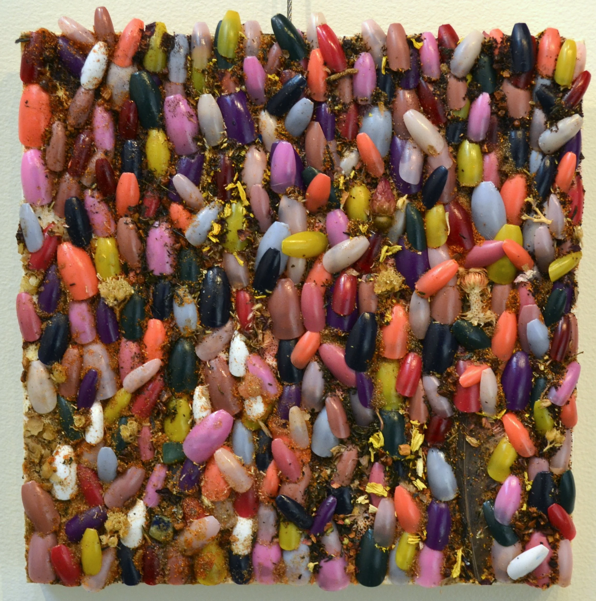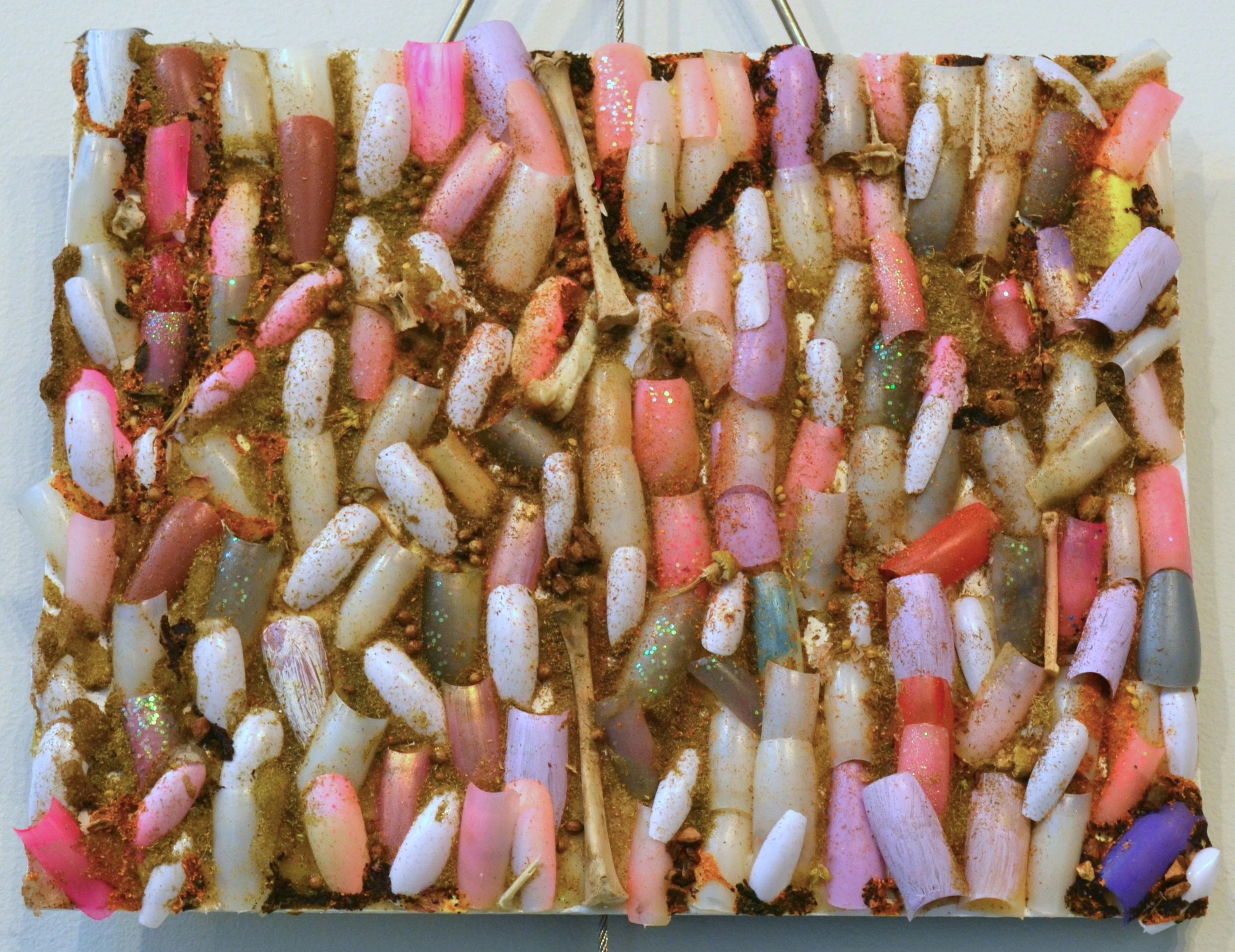 In a series of works using acrylic nails, Dillavou explores the mystical, primordially violent nature of feminine rituals. Acrylic nails, extending one’s fingers into claws, can beckon to come hither or strike in defense. The frameless works with nails and bones protruding out from the edges are the most striking. Digging your way out layers clashing nail colors with crumbled herbs and flowers. Black satin thumb nails scatter around the panel like decomposer beetles. In Dirt Under Nails I, pastel pink nails clatter together amongst a handful of embedded animal bones. As Wallace Stevens so aptly put it, “Death is the mother of beauty.”