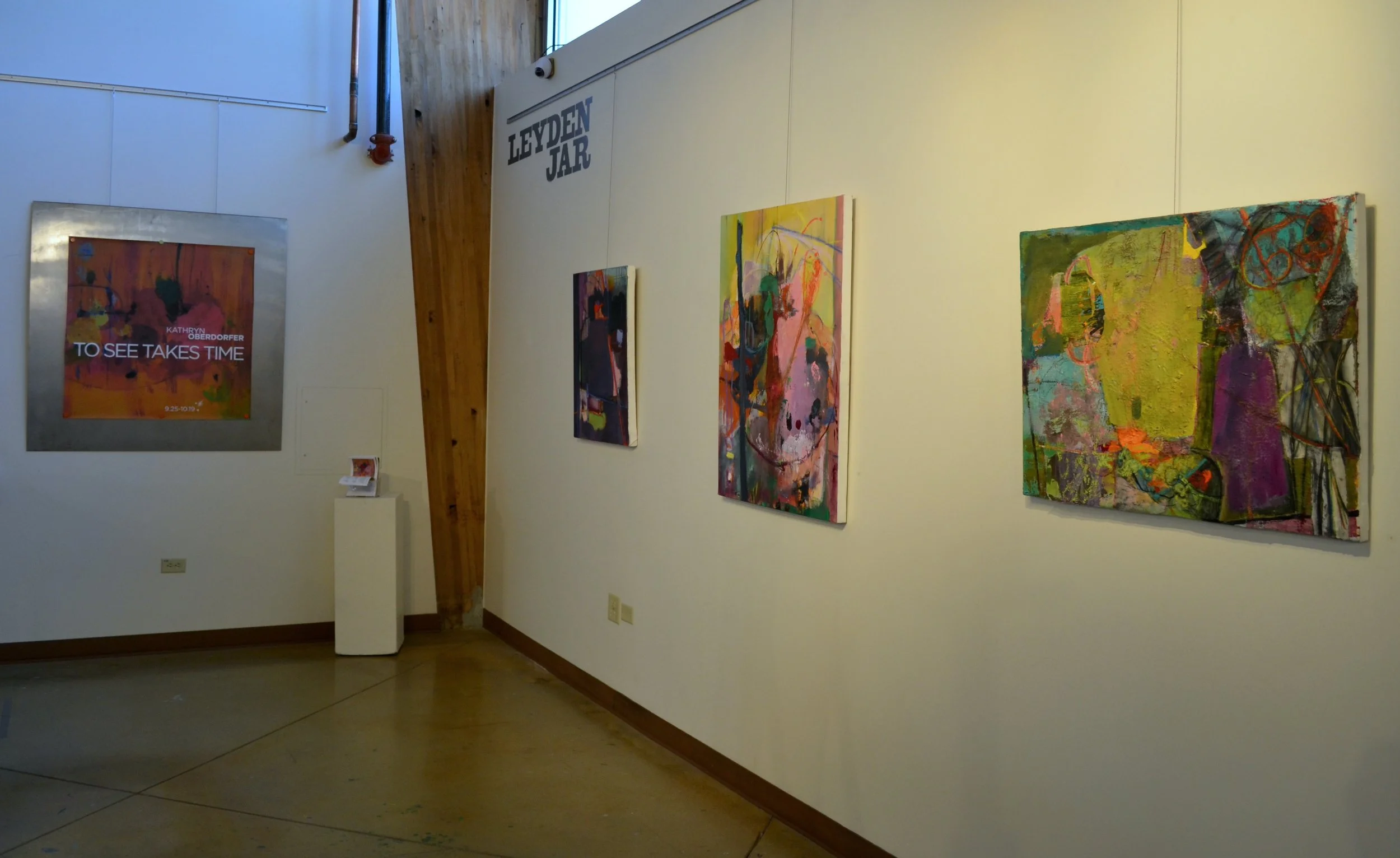 In the Leyden Jar Gallery, towards the back of Art Gym’s work space, Kathryn Oberdorfer’s solo exhibition To See Takes Time favors looser lines and an abstract expressionist approach to composition. The paintings are not splatter art (thankfully), but they do seem to delight in the complexity of a well-observed spill and unexpected conglomerations.